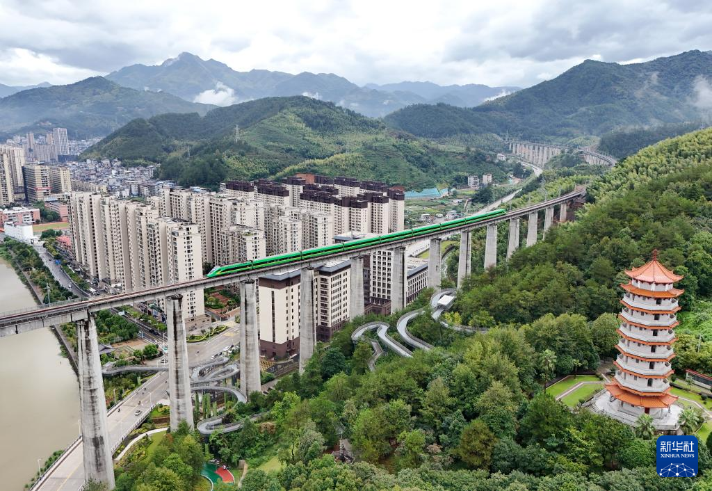 9月24日,“绿巨人”新型动车通过衢宁铁路政和熊城特大桥(无人机照片)。