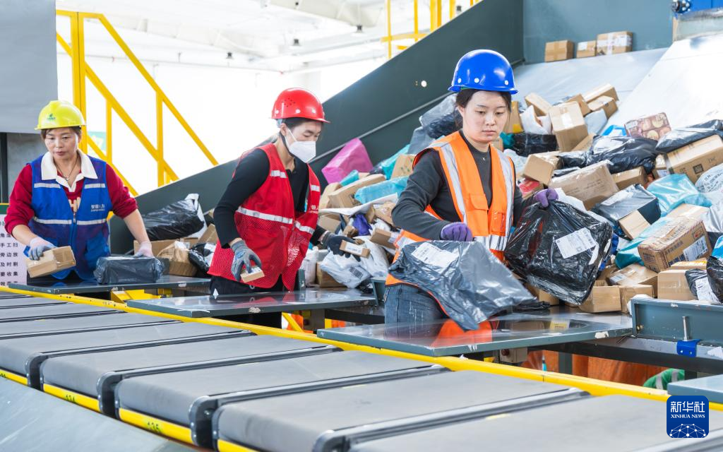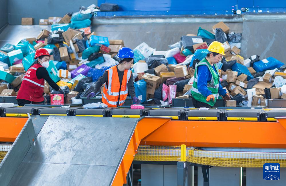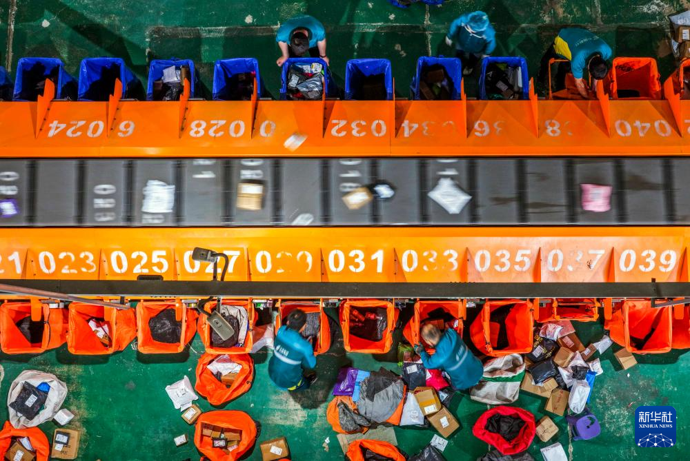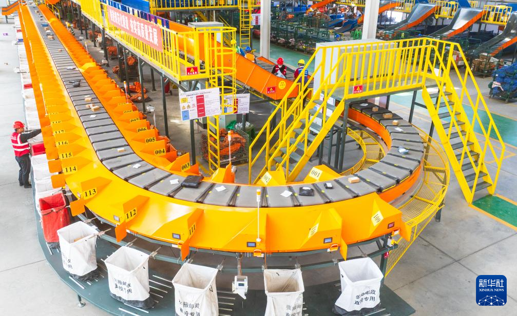 10月2日,工作人员在中国邮政集团有限公司甘肃省张掖市分公司邮件处理中心智能分拣流水作业线上工作。