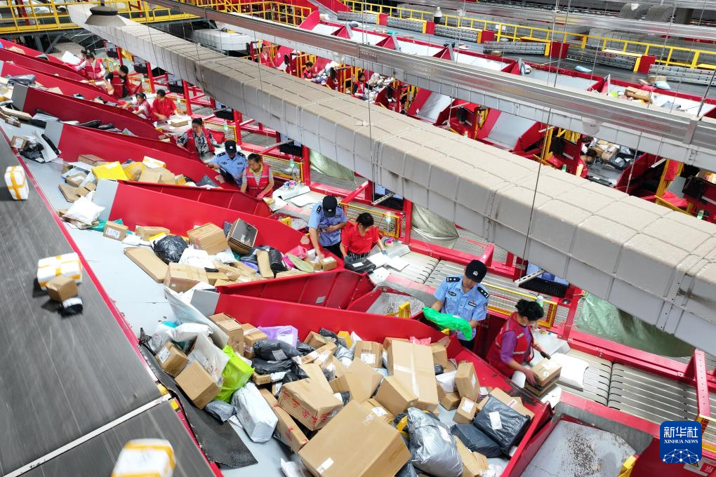 10月2日,江苏省宝应县公安局泾河派出所民警辅警对辖区一家物流企业快递包裹进行安全检查。