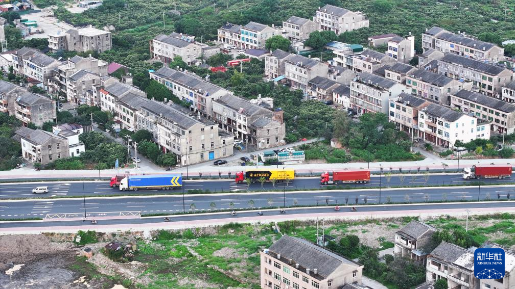 10月5日,物流运输车辆行驶在浙江省台州市路桥区的古窑大道上(无人机照片)。