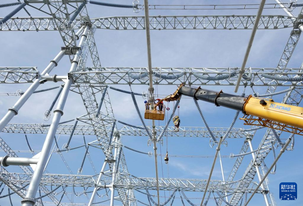 10月14日,工人在位于河北省宁晋县境内的国网邢台北500千伏超高压变电站建设工地施工。