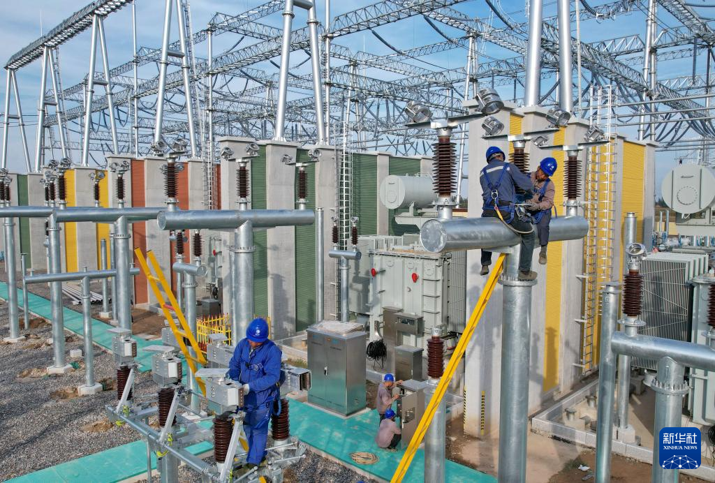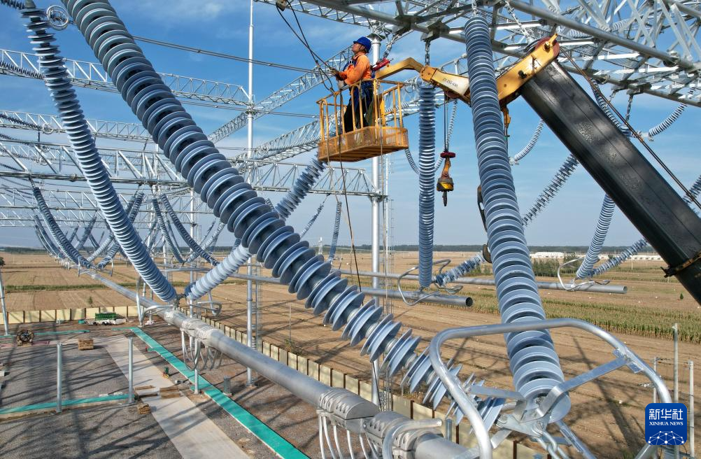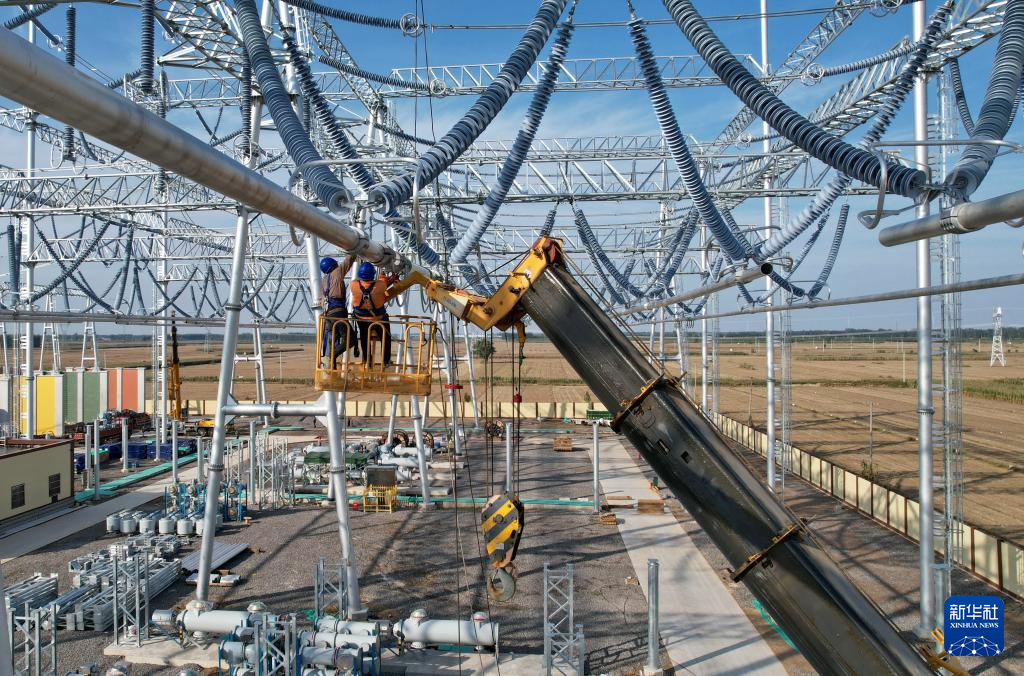 10月14日,工人在位于河北省宁晋县境内的国网邢台北500千伏超高压变电站建设工地施工(无人机照片)。
