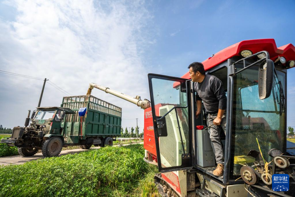 10月15日,在南县南洲镇育才村,农机手将收获的水稻装入运粮车。