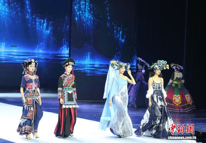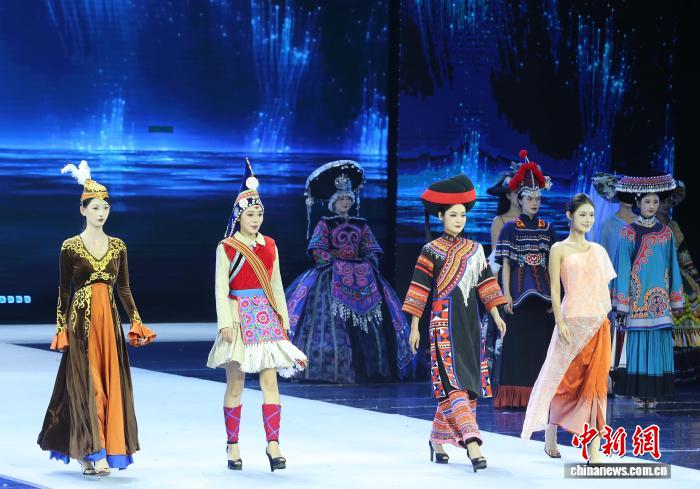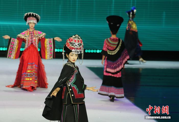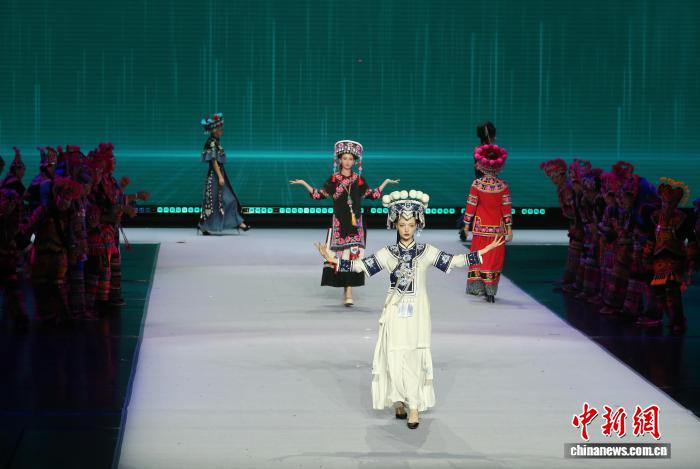 10月13日晚,模特展示楚雄州永仁县彝族服饰。当日,“第三届楚雄时装周·中国国际时装周”在云南省楚雄彝族自治州楚雄市启幕,模特展示了云南、四川、贵州、海南等地的非遗精品服装服饰及南亚、东南亚国家的精品服装共计360余套,为观众奉献了一台视觉盛宴。中新社记者黄兴鸿 摄