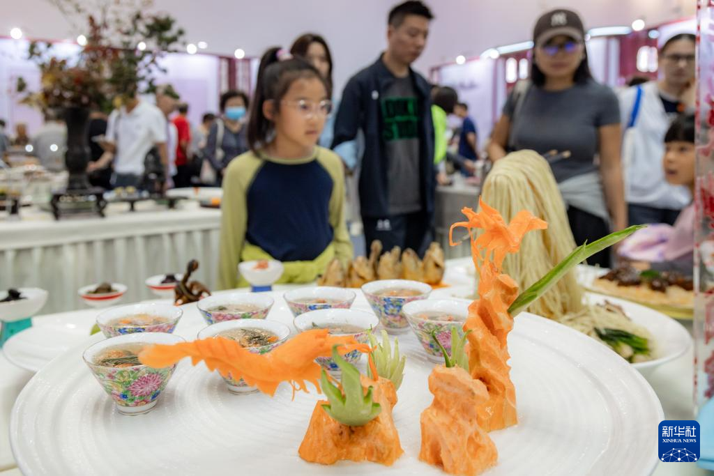 10月18日,观众在博览会上观看展出的菜品。