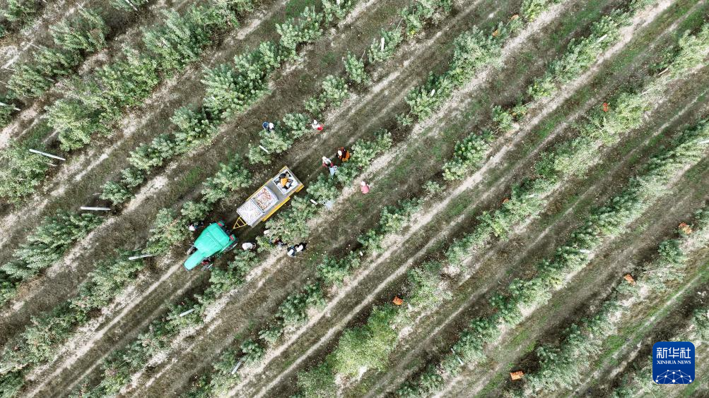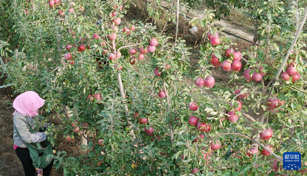 农户在中卫市沙坡头区“旱苹果”种植基地采摘苹果(10月25日摄,无人机照片)。