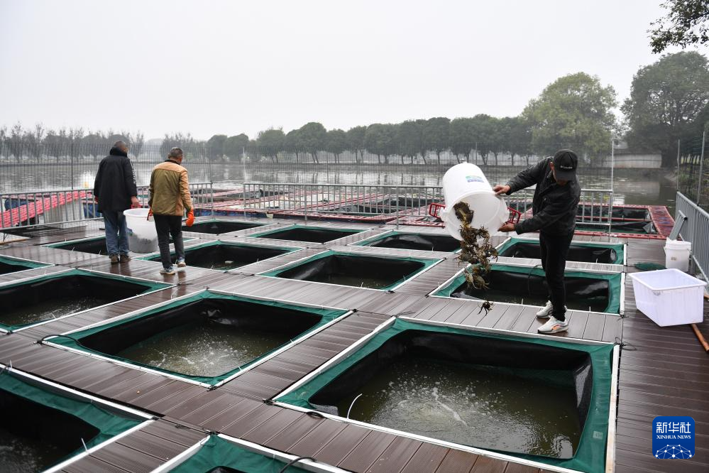10月30日,在大通湖区河坝镇,蟹农将分拣后的大闸蟹投入暂养池。