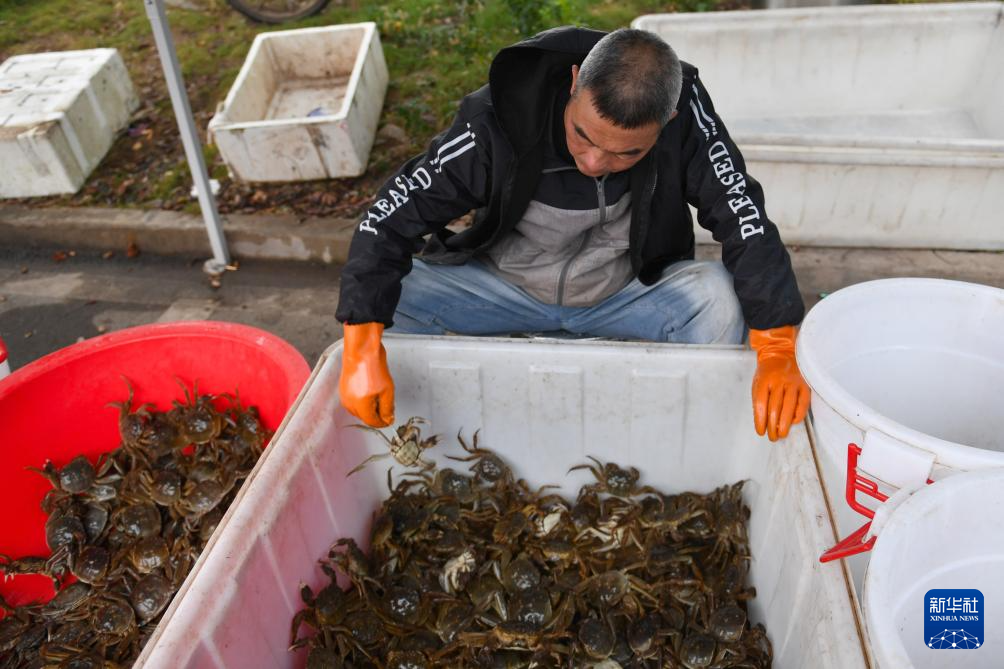 10月30日,在大通湖区河坝镇,蟹农在分拣公蟹、母蟹。