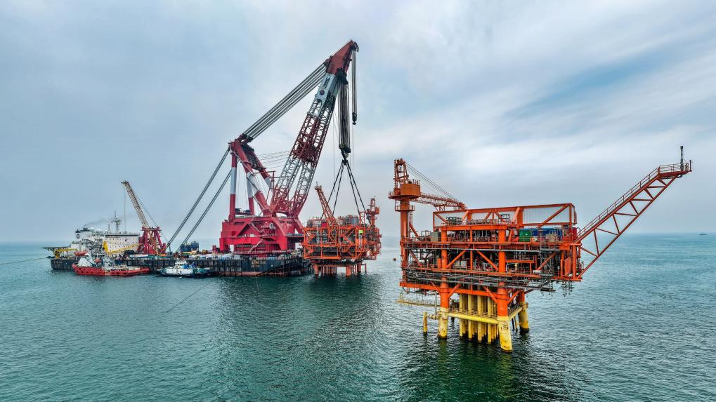 9月8日,垦利6-1油田10-1北区块Ⅱ期开发项目油气平台在渤海海域完成海上安装(无人机照片)。新华社发(杜鹏辉摄)