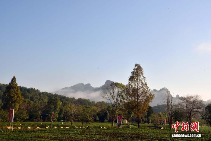 图为茶园里远山、云雾与初红水杉相映,景致宜人。中新网记者张丽君 摄
