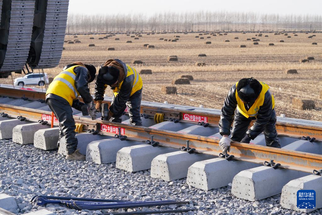 11月25日,工人在黑龙江省绥化市庆安县永华村哈伊高铁哈铁段铺轨现场工作。
