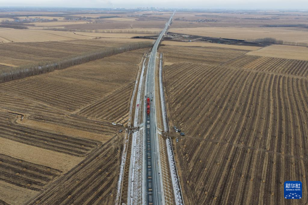 这是11月25日在黑龙江省绥化市庆安县永华村拍摄的哈伊高铁哈铁段铺轨现场(无人机照片)。