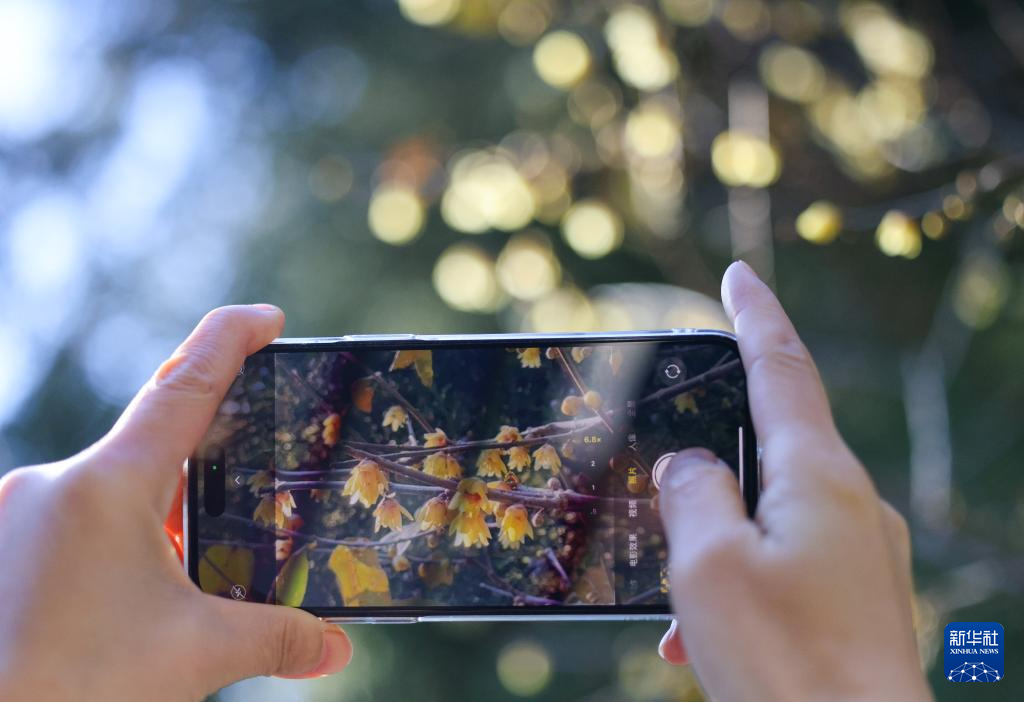 12月4日,游客在卧佛寺拍摄腊梅。