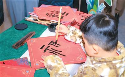 6岁的截瘫患儿周周(化名)拨动轮椅车轮,在展厅内兴奋地灵活穿梭。在中国康复研究中心北京博爱医院的书法疗愈展台前,他主动提起毛笔,在红纸上工整写下隶书“福”字送给记者,“我练书法一年半了,软笔硬笔都会!”