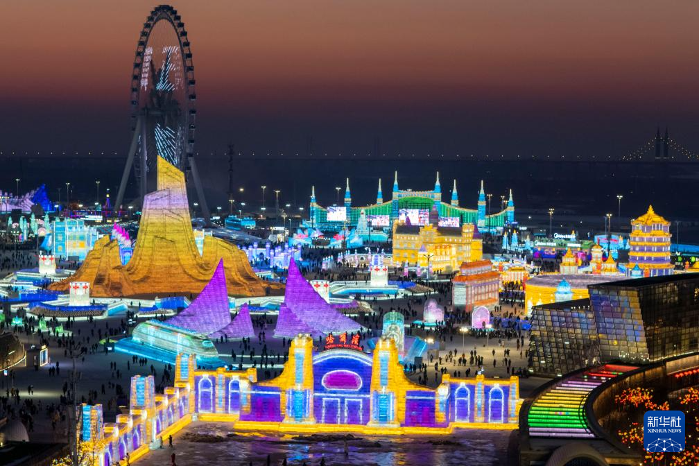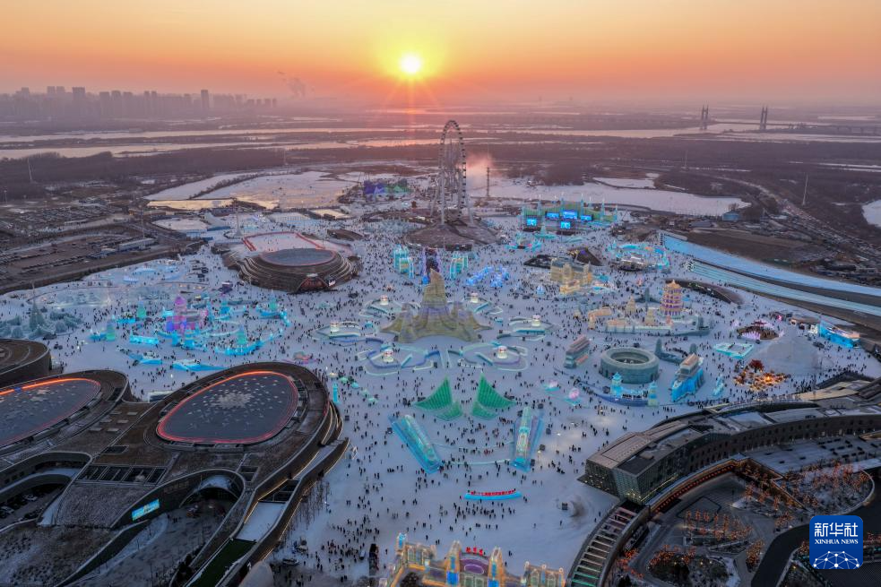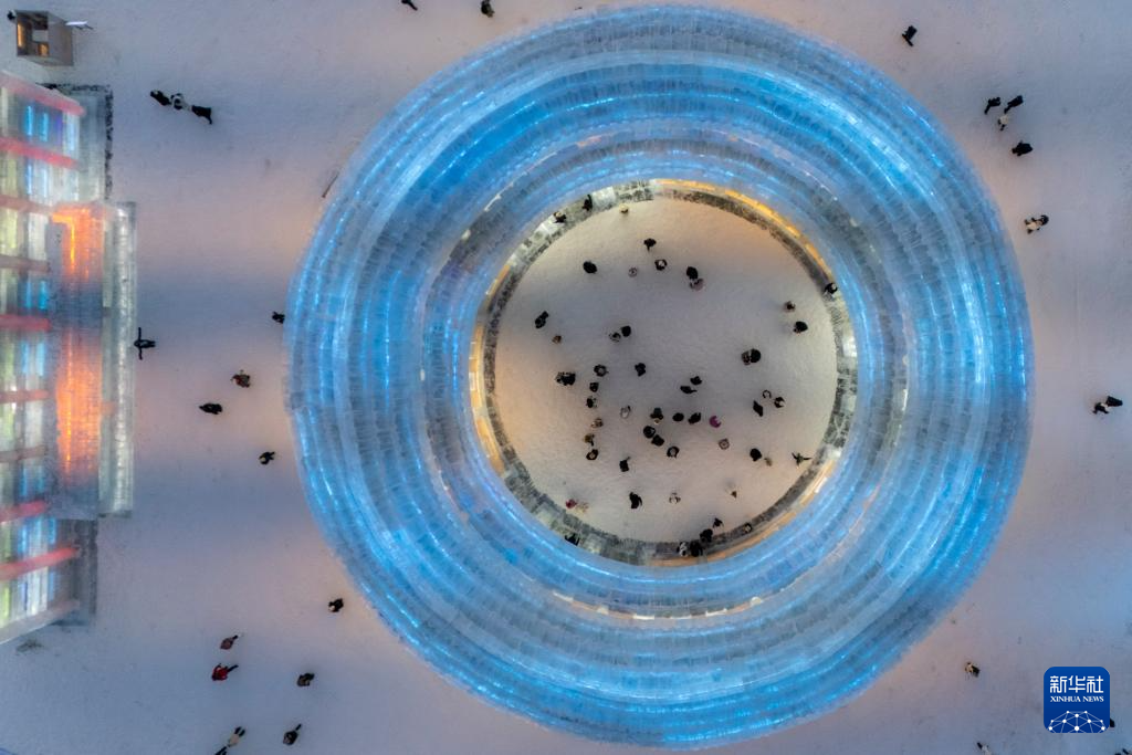 12月17日,游客在哈尔滨冰雪大世界园区游玩(无人机照片)。