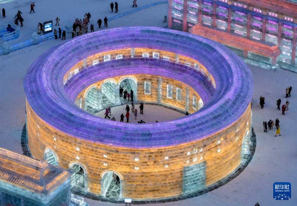 这是12月17日拍摄的哈尔滨冰雪大世界园区内的冰建景观(无人机照片)。