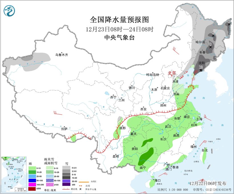 图3 全国降水量预报图(12月23日08时-24日08时)