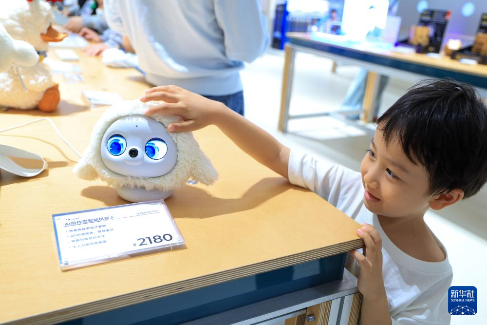 12月21日,在位于深圳的全球创新旗舰店inno100,一名儿童与AI玩具Ropet互动。