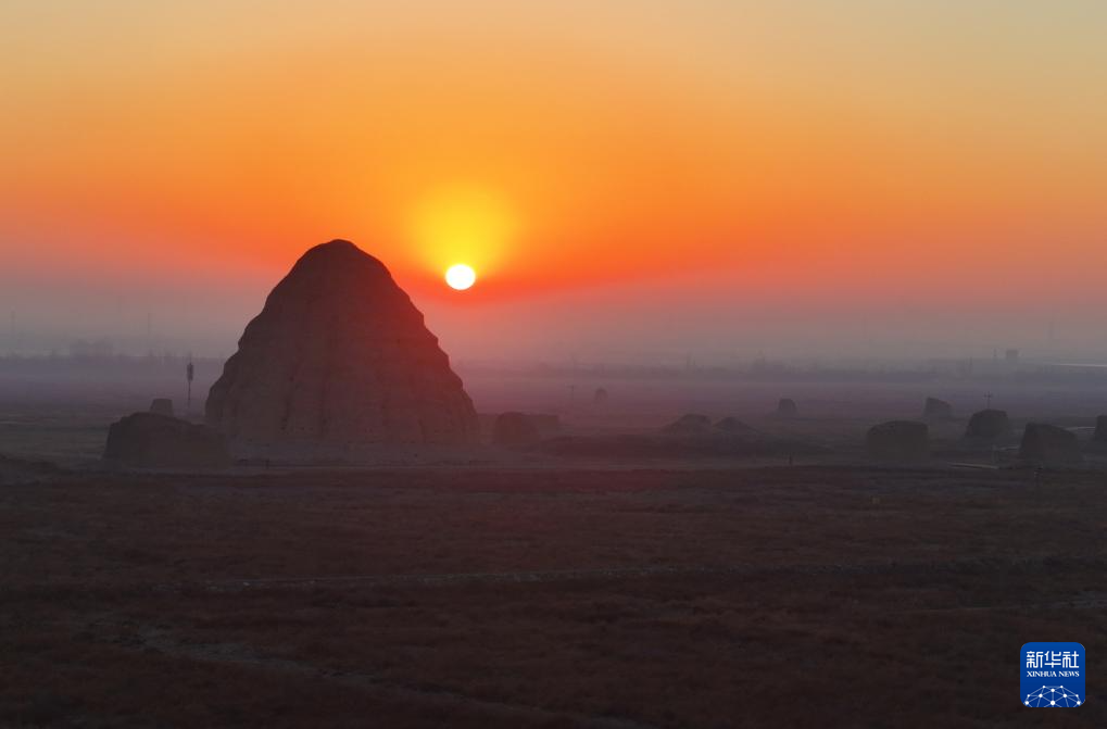 寒冬时节,晨曦中的西夏陵与缤纷霞光及峰峦叠嶂的贺兰山共同形成雄伟壮丽的景观。