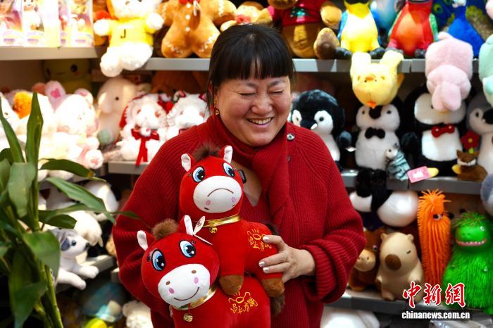 1月11日,浙江义乌商户张火清展示“笑笑马”和“哭哭马”,因订单飞增笑到合不拢嘴。一位网友近日购入产自浙江义乌的马年毛绒玩具,发现一只次品——其嘴部被缝反,看上去十分委屈。“笑笑马”变成了“哭哭马”,相关话题冲上中国多个社交平台热搜榜,采购订单飞增,商户开了十多条生产线正加紧赶货。中新社记者董易鑫 摄