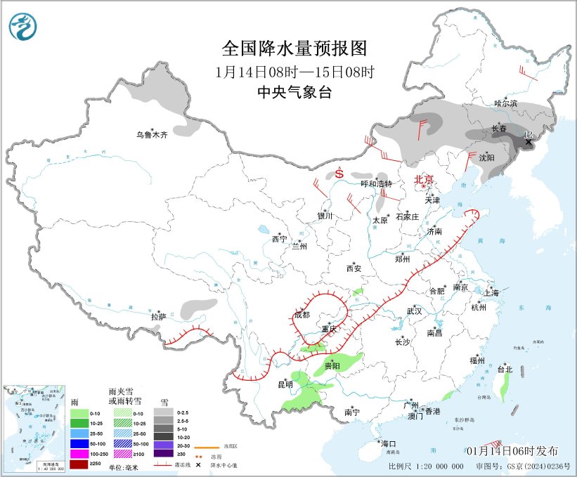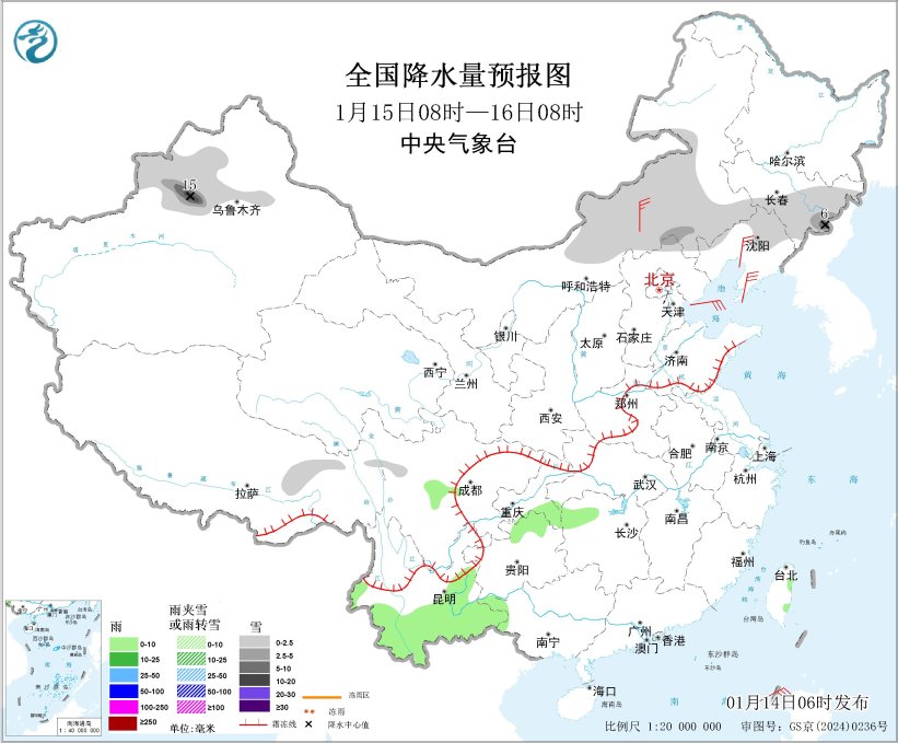 图1 全国降水量预报图(1月14日08时-15日08时)