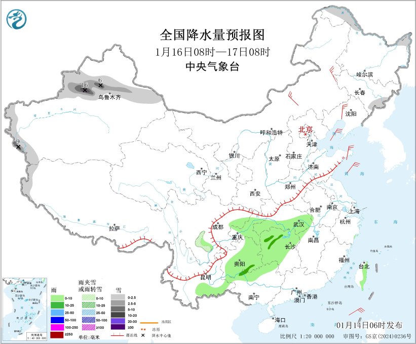 图2 全国降水量预报图(1月15日08时-16日08时)