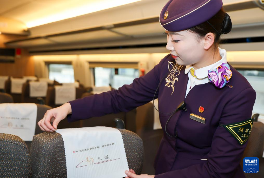 2月1日,铁路上海客运段列车长在G12次列车上整理静音车厢标语。