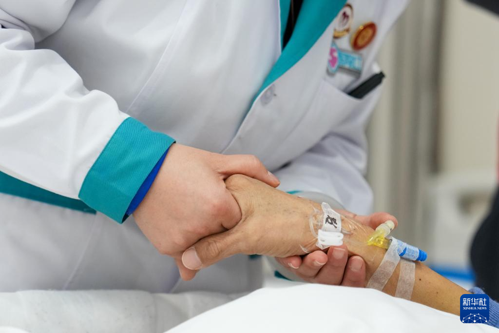 2月5日,在丰台区蒲黄榆社区卫生服务中心,医务社工郭翠红(左一)握着一名70岁的癌症患者的手和她交流。