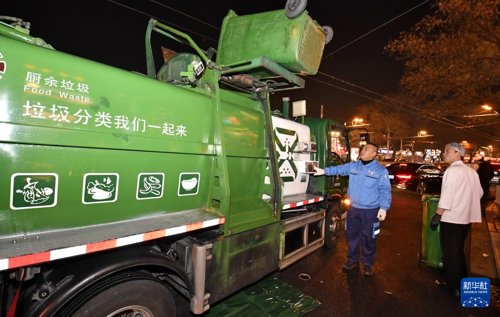 北京环卫集团餐厨垃圾清运工李宁在装运厨余垃圾(2月4日摄)。