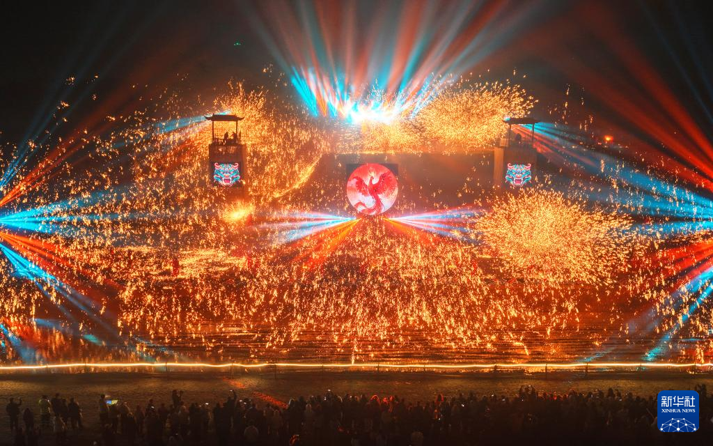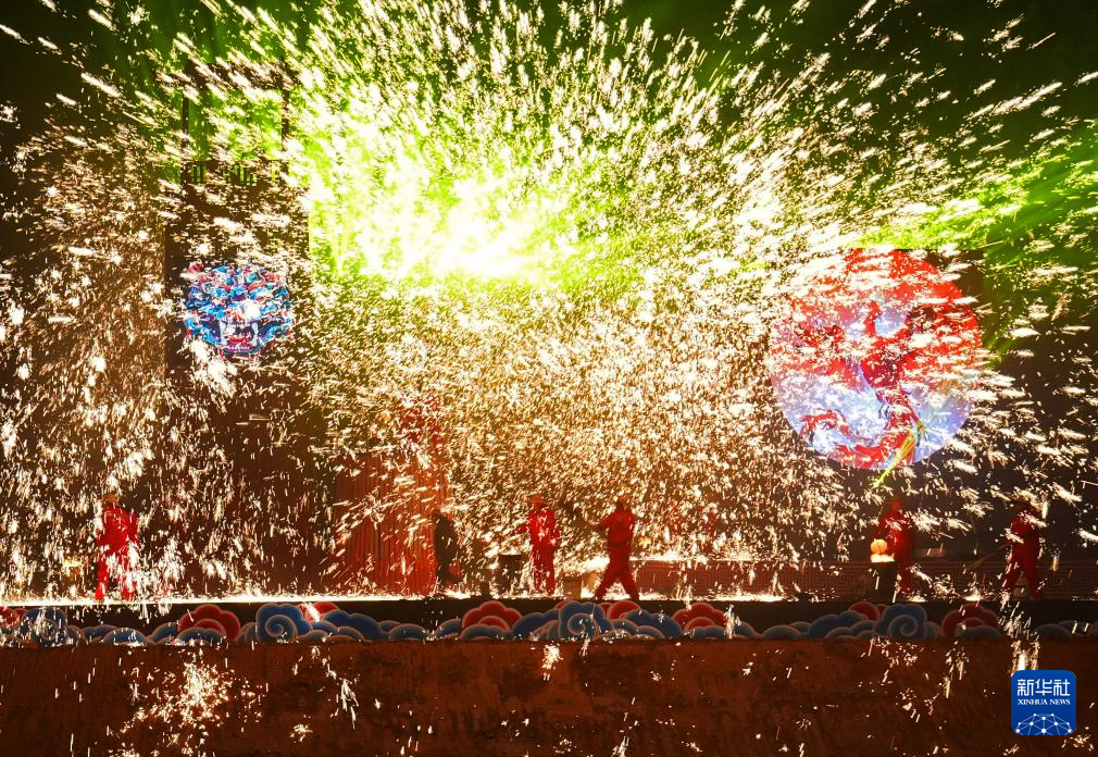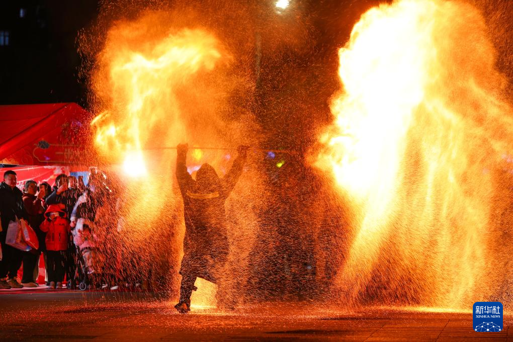 2月13日,在湖南省衡阳市南岳区1944景区,民间艺人表演打铁花。