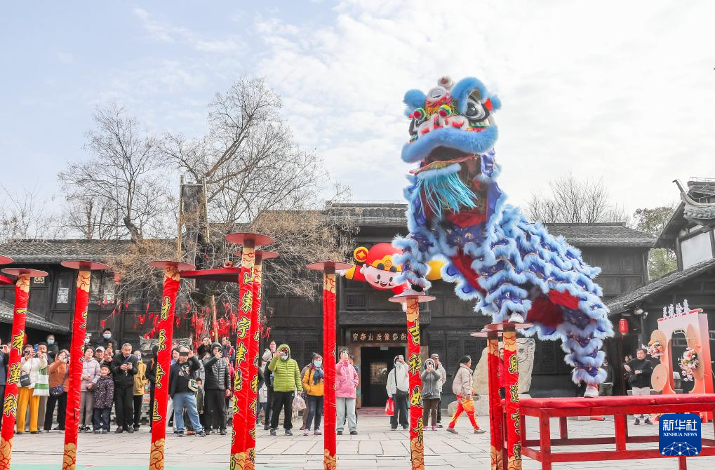 2月23日,游客在江苏省句容市宝华山国家森林公园观看舞狮表演。