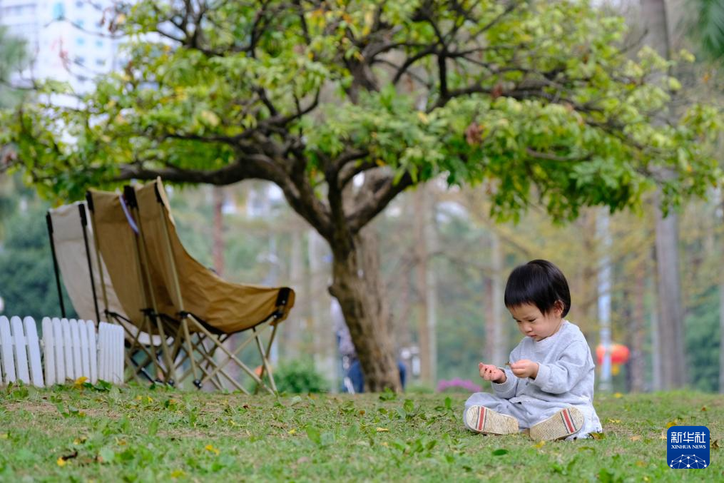 2月23日,一名小朋友在广西南宁市南湖边绿地上玩耍。
