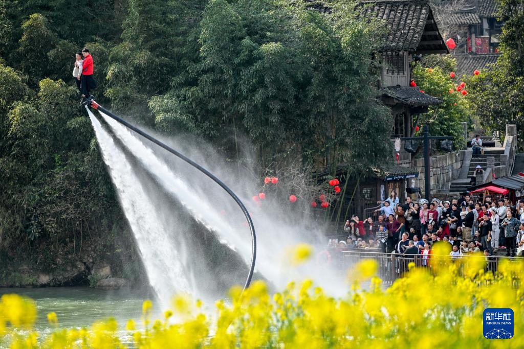 2月23日,游客在贵州省遵义市乌江寨景区体验“水上飞人”项目。