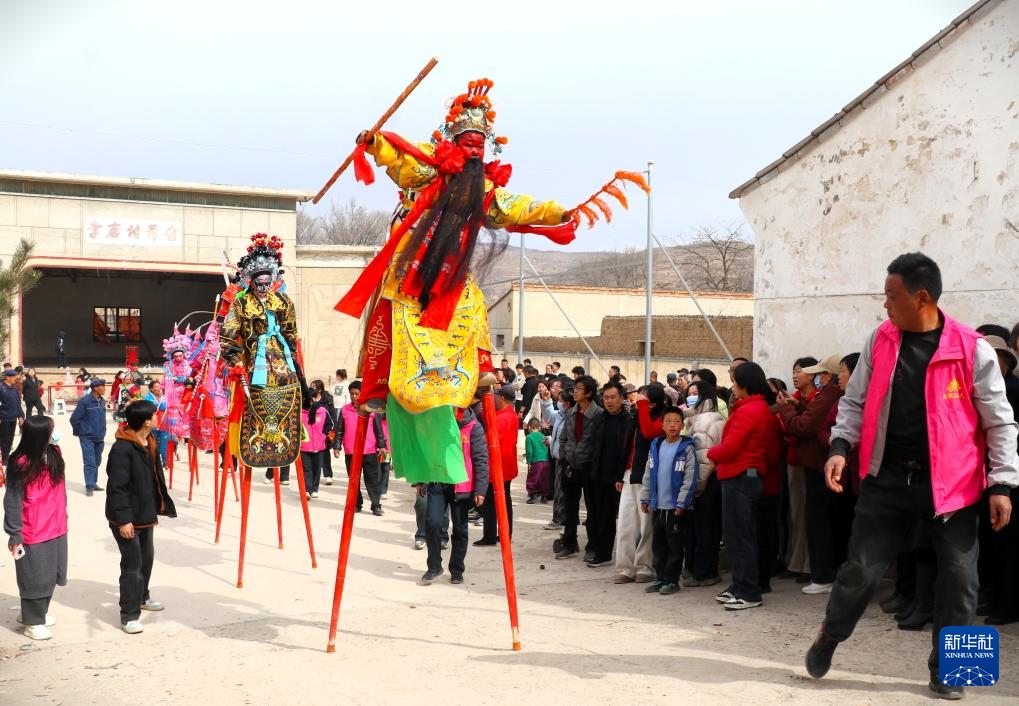 2月23日,社火队员在甘肃省平凉市静宁县李店镇李店村表演踩高跷。