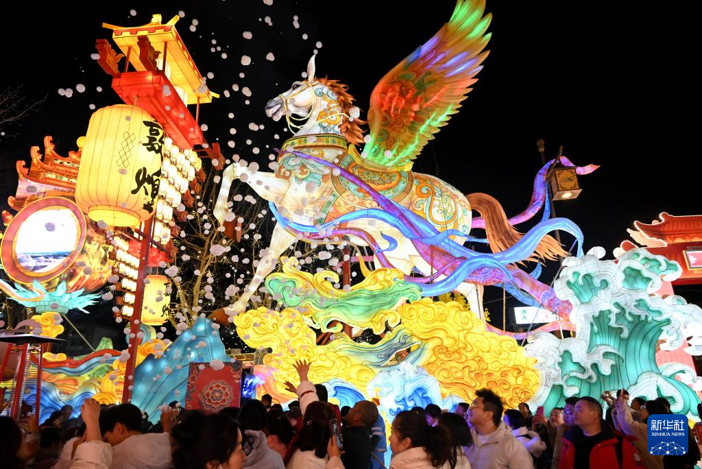2月22日晚,游客在甘肃省敦煌市的灯会上观赏花灯。