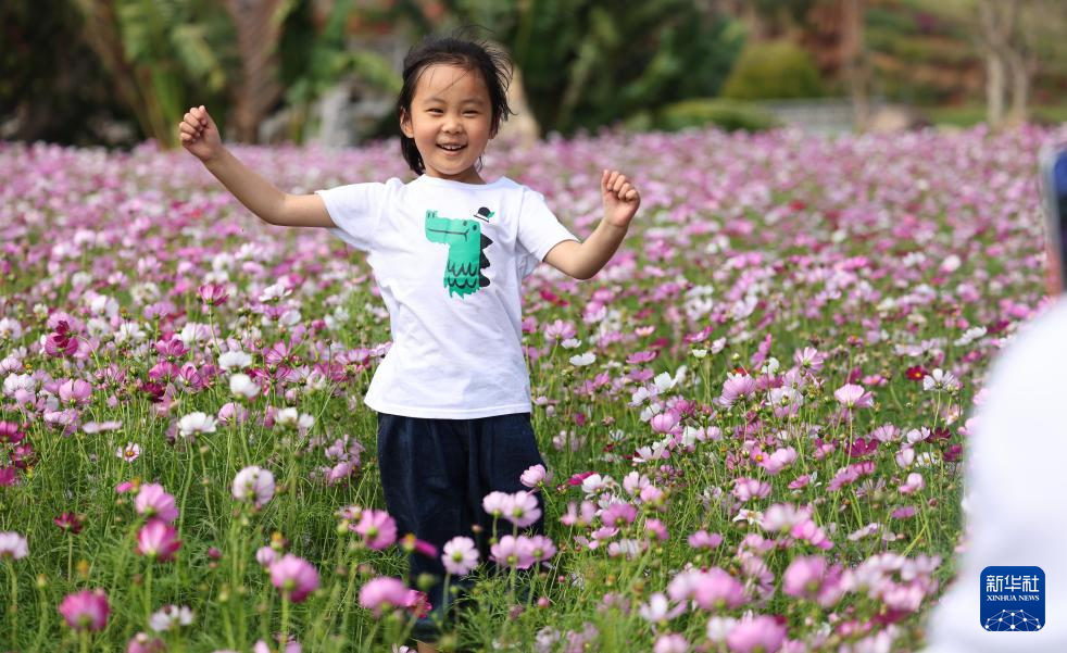 2月22日,一名小朋友在海南三亚南山文化旅游区花海中玩耍拍照。
