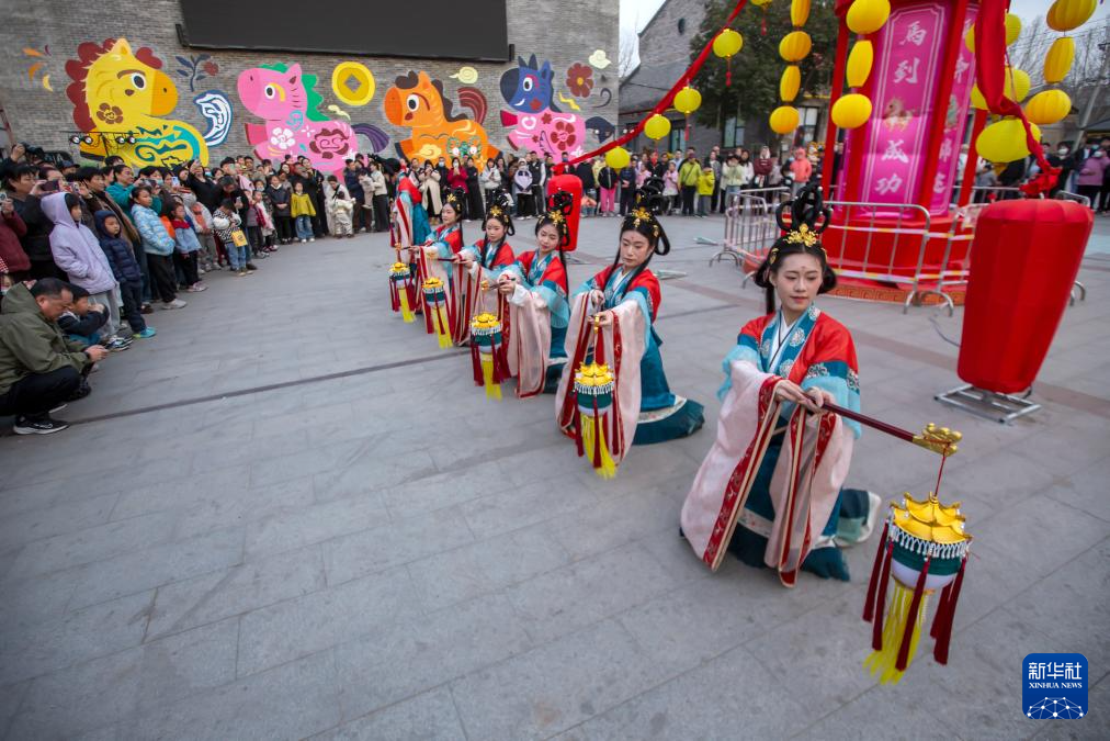 2月22日,游客在河南安阳考古小镇观看灯舞表演。