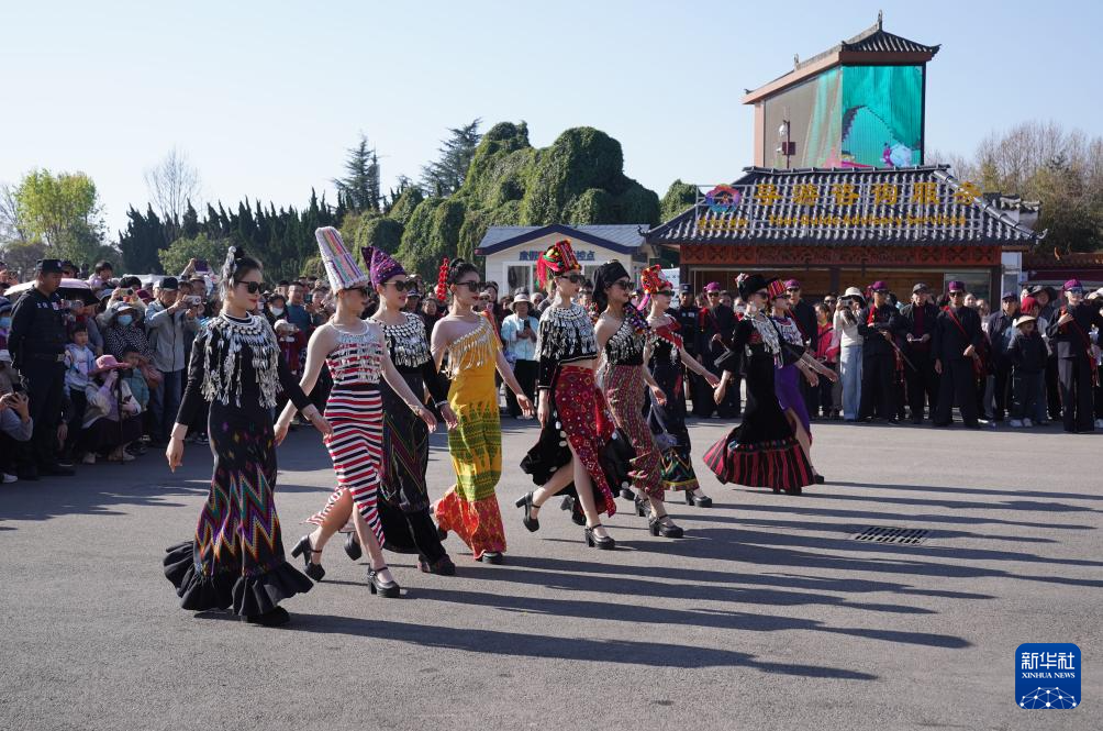 2月22日,云南民族村的演员为游客展示民族服饰。
