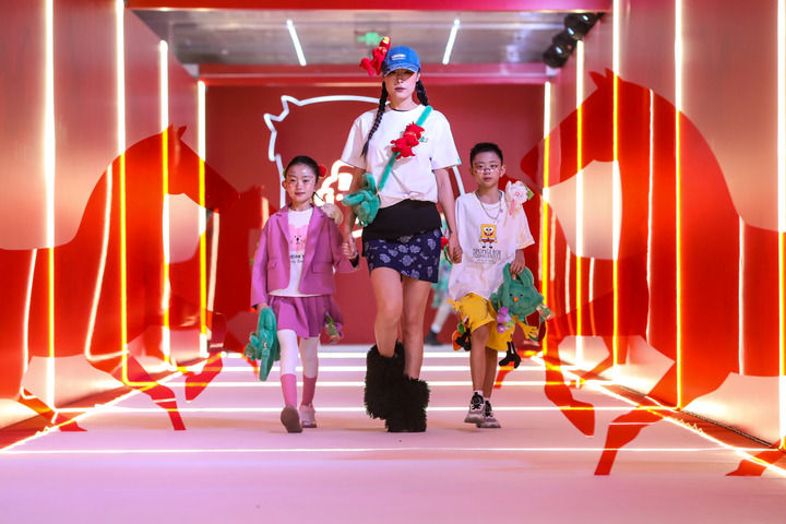 1月26日晚,在甘肃省博物馆一楼大厅,模特(中)佩戴新款马踏飞燕贺岁毛绒玩偶“红运当头马”走秀。新华社记者 郎兵兵摄