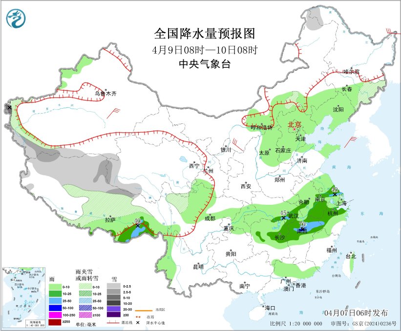 图4 全国降水量预报图(4月9日08时-10日08时)