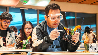4月9日,在青岛市康养领域具身机器人暨智能康复类产品训练验证中心,老人在参观脑机智能设备。
