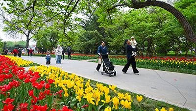 4月9日,在青岛市康养领域具身机器人暨智能康复类产品训练验证中心,老人在与智能陪伴机器人互动。