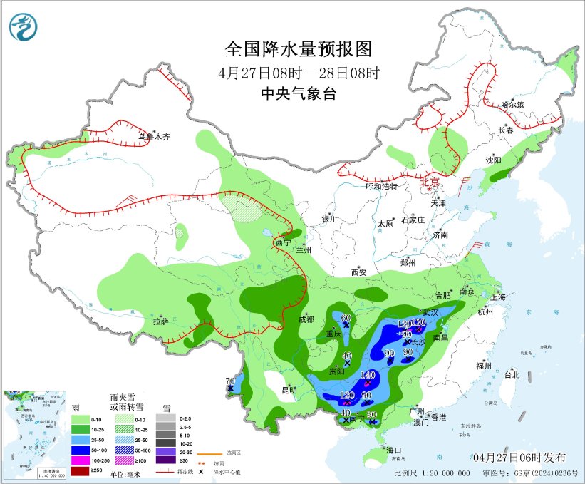 图4 全国降水量预报图(4月27日08时-28日08时)