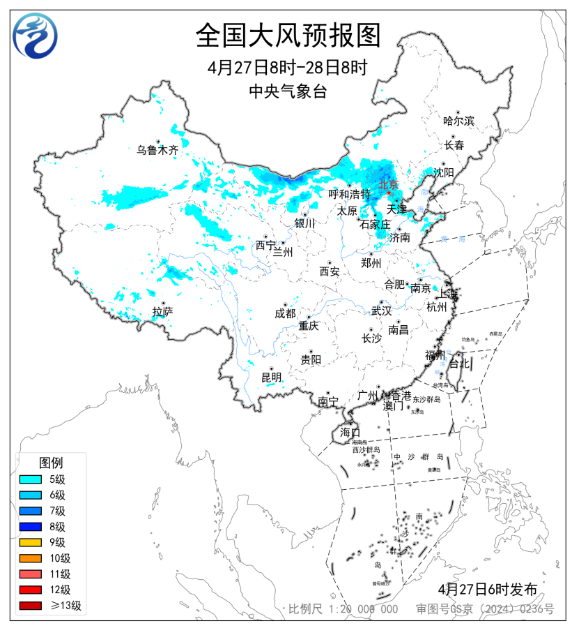 预计,4月27日08时至28日08时,内蒙古中西部、山西东北部、河北北部和西部、北京、天津、辽宁中西部、山东东部等地部分地区有6~8级风,阵风8~10级,局地阵风可达11级以上(见图3)。 中央气象台4月27日06时继续发布大风黄色预警。