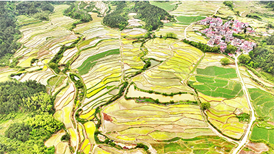江西省吉安市永丰县潭城乡睦源水库灌区,完成早稻栽插后的梯田色彩斑斓,与民居、青山相映成景,构成一幅春日生态田园画卷。
