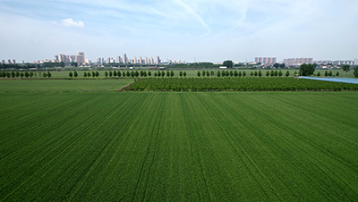 河南省长葛市田野广袤,青绿麦田绵延铺展,挺拔桐树繁花满枝,乡野绿意盎然。
